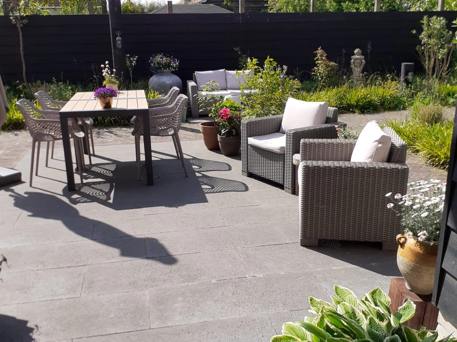 Twee persoons studio [alleen volwassenen, dus ook geen baby's]. Een comfortabele studio op de begane grond aan de noord oostkant, met ruime badkamer. Buiten zit je fijn op het gezamenlijke terras op het zuiden. Aanrechtje met waterkoker, Nespresso apparaat, koelkastje en gebruik magnetron. Geen kookmogelijkheid.