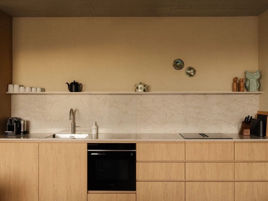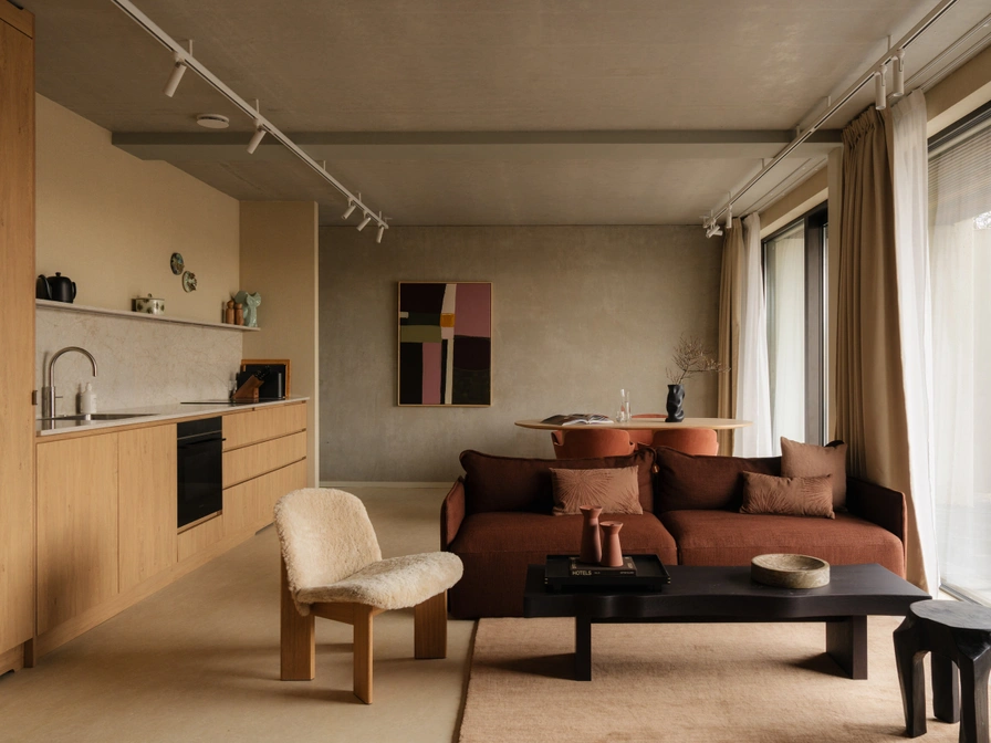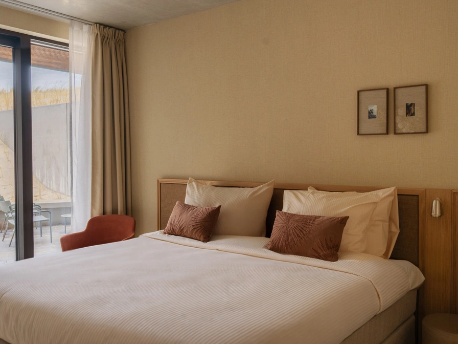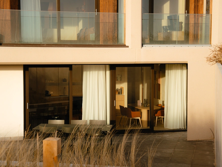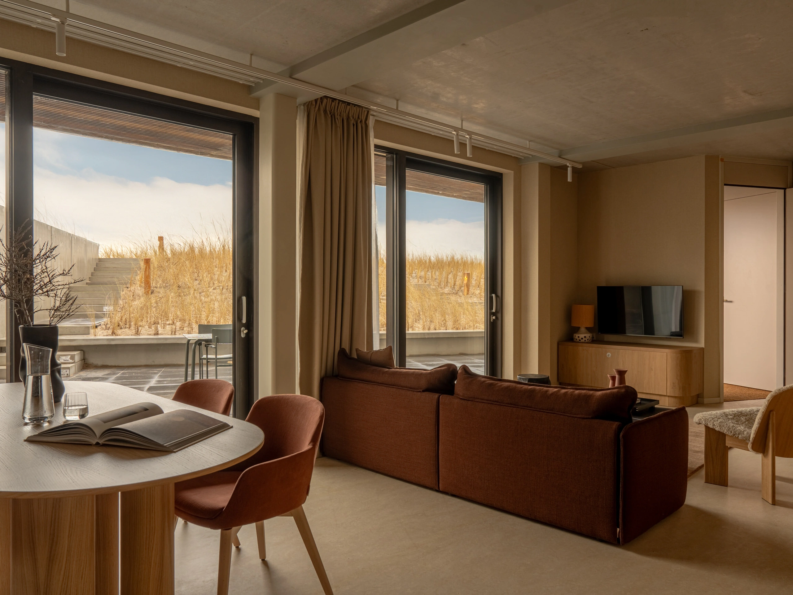 Dit ruime hoekappartement bevindt zich op de begane grond en biedt directe toegang tot de duinen. Je verblijft gelijkvloers en beschikt over een eigen opgang. Aan de voorkant heb je een ruim terras met grote eettafel en een kleiner terras met zitje aan de achterkant. Het appartement beschikt over twee stijlvolle slaapkamers met luxe boxspringbedden en hoogwaardig bedlinnen, elk voorzien van een eigen badkamer met inloop-regendouche, exclusieve Zenology® verzorgingsproducten, zachte handdoeken, badjassen, slippers en een haardroger. De open keuken is volledig uitgerust en biedt alle moderne faciliteiten die je nodig hebt: een koffiemachine (cups), Quooker®, vaatwasser, koelkast met vriesvak, inductiekookplaat, een uitgebreide pannenset en hoogwaardig servies en glaswerk. De woonkamer is smaakvol ingericht met een comfortabele bank, fauteuils en een Smart TV. Vanuit hier stap je zo het privéterras op, voorzien van stijlvol buitenmeubilair. Dankzij de vrije ligging geniet je van directe uitloop naar de duinen – een unieke plek waar binnen en buiten moeiteloos in elkaar overgaan. Het appartement beschikt bovendien over gratis WiFi, een wasmachine en een droger voor extra gemak. In de hal is een apart toilet.