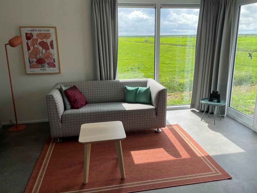 Vanuit de woonkamer vrij uitzicht over de polder richting de Waddendijk. Geschikt voor de gast die zeker houdt van de stilte. Het terras kan worden afgesloten door een hekje op te hangen, zodat het omheind is zodat je kind of hond er veilig kan zijn.