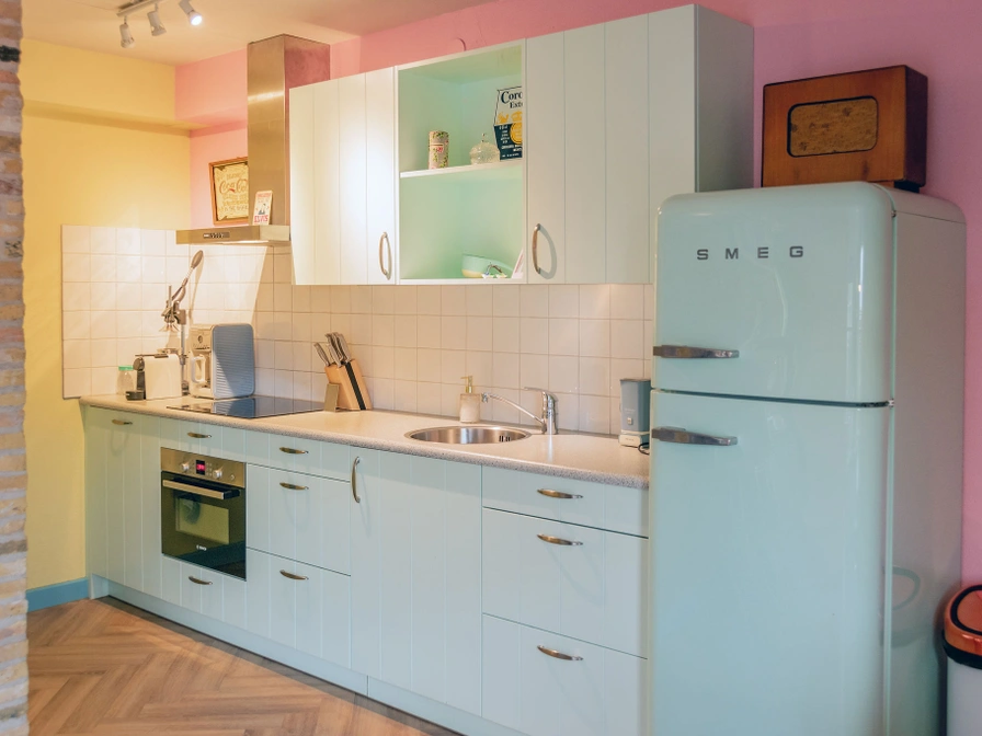 Graceland lives up to its name with its furnishings in the style of the 1950s and 1960s, including a jukebox (for decoration) and a record player. Centrally located in the village of Hoorn on the southwest side. Super interior for the Elvis fan with Smart TV in the village of Hoorn, near shops and restaurants. Free WiFi and Netflix, equipped kitchen with dishwasher, oven with microwave function, juicer, toaster, Nespresso and more. On the ground floor is the living room with a 2-seater sofa, an armchair and a coffee table. Open kitchen with 4 burner stove and large SMEG refrigerator. There is a separate toilet in the hall. Downstairs is the bathroom with sink, washbasin and rain shower. On the first floor are two bedrooms, each with 2 x 1 person box spring beds. Children's furniture consisting of cot (including linen, playpen and chair) is available on request. Charging option for the electric bicycle and storage possible. You are not allowed to bring pets to Graceland.