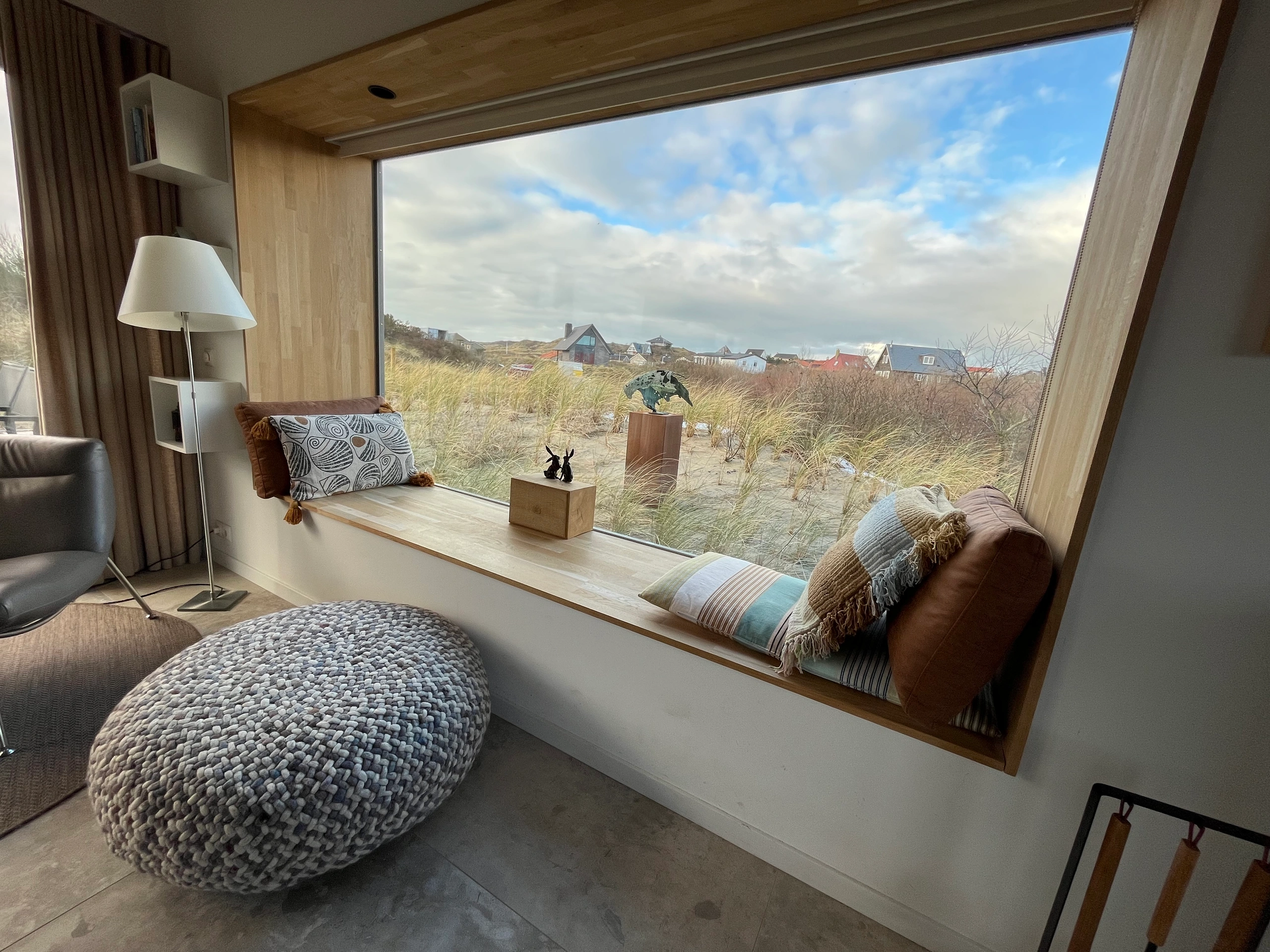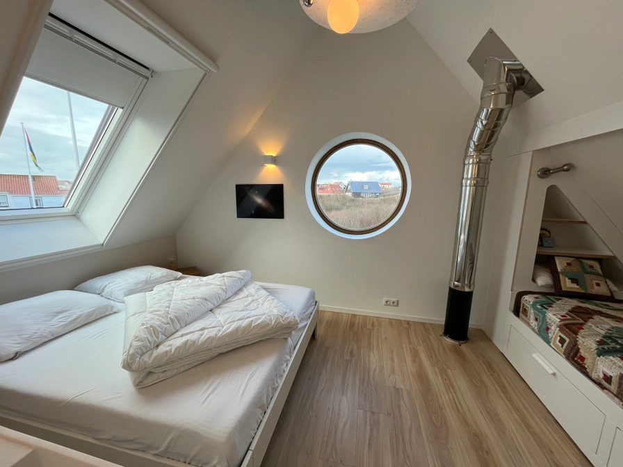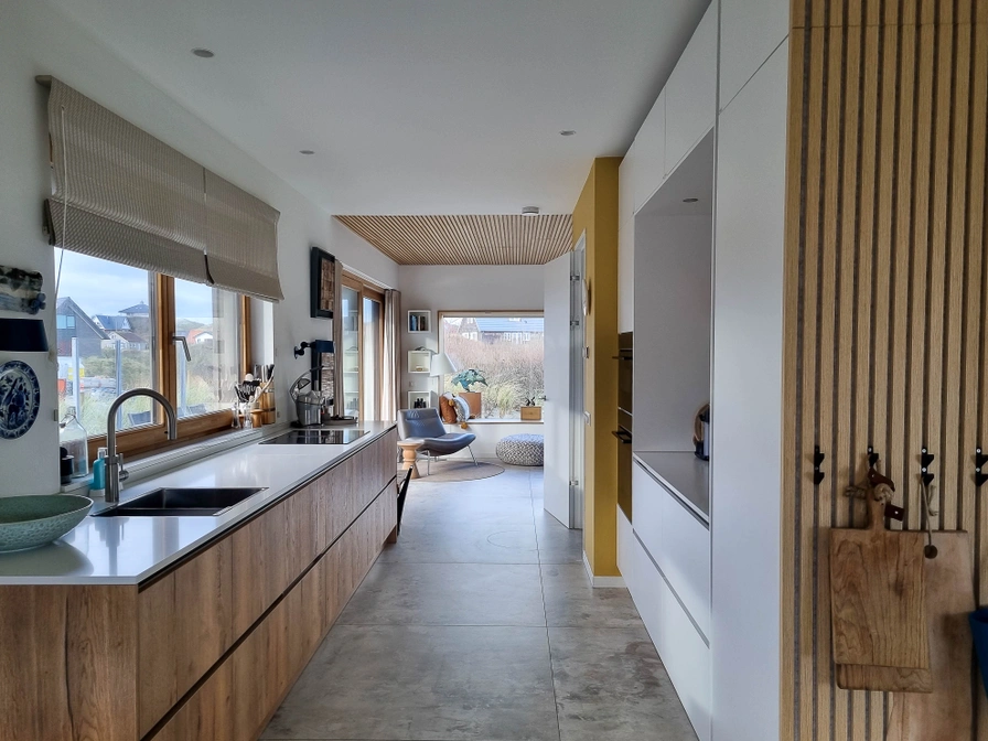 Luxe en duurzaam vakantiehuis in de duinen van Midsland aan Zee – 't Kaapse Duin 't Kaapse Duin is een onder architectuur gebouwd vakantiehuis op Terschelling, prachtig gelegen in de duinen van Midsland aan Zee. Dit luxe en duurzame vakantiehuis biedt rust, privacy en comfort op een unieke locatie midden in de natuur. Vanuit alle zijden van het huis geniet je van een schitterend uitzicht over het duingebied. Het vakantiehuis is duurzaam gebouwd en voorzien van een grondwarmtepomp en zonnepanelen, wat zorgt voor een aangenaam binnenklimaat in zowel zomer als winter. Voor extra sfeer en warmte is er een houtkachel in de woonkamer. De inrichting is stijlvol, rustig en comfortabel. Rustige ligging in de duinen van Terschelling Het huis ligt aan een rustig doodlopend weggetje in het duingebied van Midsland aan Zee. Rondom het vakantiehuis is nieuwe natuurlijke begroeiing aangelegd, wat zorgt voor veel privacy en een mooie, groene uitstraling. Er zijn twee ruime terrassen waar je in alle rust kunt genieten van het buitenleven. Ruime woonkamer en luxe keuken: Via de entree bereik je de hal en toegang tot de kelder. In de hal bevinden zich een kapstok en een toilet. De lichte en sfeervolle woonkamer beschikt over een comfortabele zithoek met een hoekbank en drie fauteuils, een houtkachel en een brede vensterbank waar je kunt zitten om te genieten van het uitzicht over de duinen. De ruime open keuken is voorzien van luxe apparatuur, waaronder een Quooker, en beschikt over ruim voldoende servies. Dit maakt het vakantiehuis ideaal voor gasten die graag koken en uitgebreid willen tafelen. Er zijn bovendien veel boeken en spelletjes aanwezig. Slaapkamers en badkamers: Op de begane grond bevindt zich de ouderslaapkamer met een tweepersoons Auping bed (180 x 200 cm) en een eigen badkamer met inloopdouche, toilet en wastafel. Op de bovenverdieping zijn drie slaapkamers: * Een ruime slaapkamer met tweepersoons Auping bed (160 x 200 cm), wastafel en een bedstee (80 x 200 cm) * Twee slaapkamers met elk twee eenpersoons Auping bedden (90 x 200 cm) Daarnaast zijn er op deze verdieping een tweede toilet en een ruime badkamer met ligbad, inloopdouche en wastafel. Alle slaapkamers zijn voorzien van horren. Sauna, buitendouche en buitenleven: In de kelderruimte met eigen entree bevinden zich een berging/garage en een Finse sauna. In de garage kun je de elektrische fiets opladen. Bij de kelderentree is een koude buitendouche, ideaal na een saunabezoek of een strandwandeling. Het oostelijke terras is ingericht met een eettafel, parasol en ligbedden. Het westelijke terras beschikt over een loungeset, een grote eettafel en een Weltevree buitenkachel op hout. In de zomer kunnen hier schaduwdoeken worden geplaatst.
